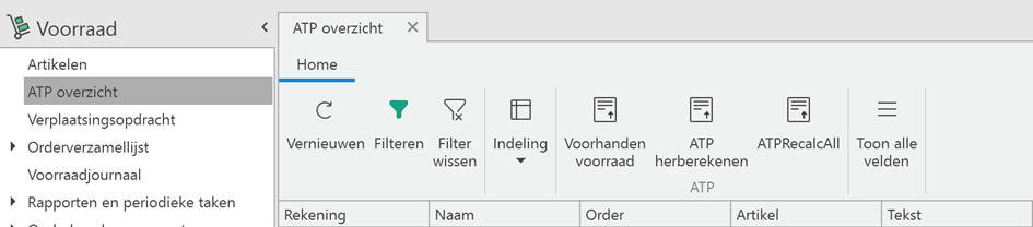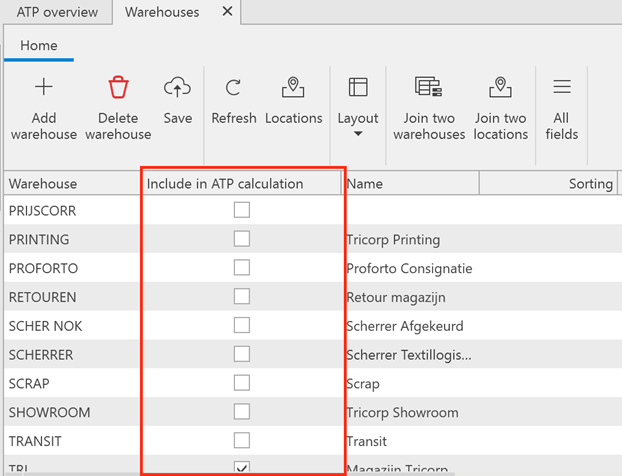 Under the tab ‘Inventory’ – ‘Maintenance’ – ‘Warehouses’ the user can determine for every warehouse if it has to be included in the ATP calculation. This can be useful when the user has for example virtual warehouses etc., these can be filtered out due to this option.