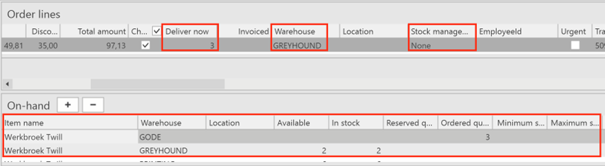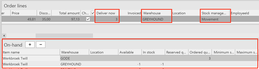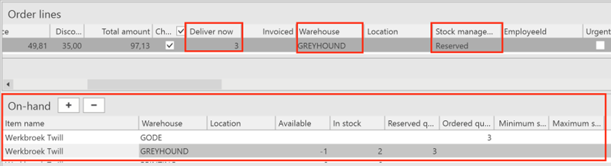 Reserved: The orderline is at the reserved quantity, available stock goes to -1 because no other orderlines can be assigned to this stock. There are still 2 items in stock because physically they didn’t move.