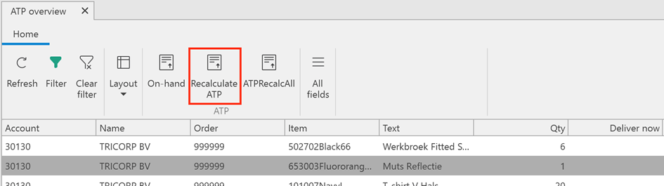 The ATP overview shows all the order lines that still need to be delivered in the system. The system prioritizes the oldest orders by default, from there on the system looks to the orderliness if they can be reserved. This algorithm is executed every morning by default but can be done manually by pressing the ‘Recalculate ATP’ button.