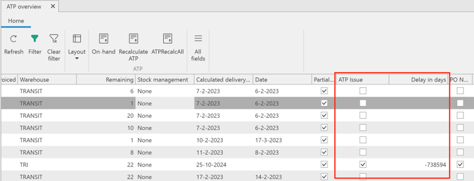 If there is an issue regarding the ATP the column ‘ATP Issue’ will be checked. The delay in days can then be found in the column ‘Delay in days’