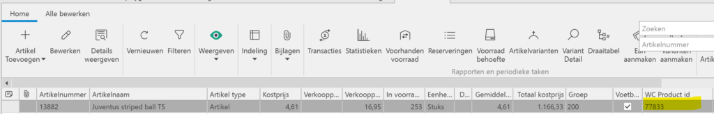 Als het artikel succesvol is gesynchroniseerd naar WooCommerce dan wordt het id dus opgeslagen: