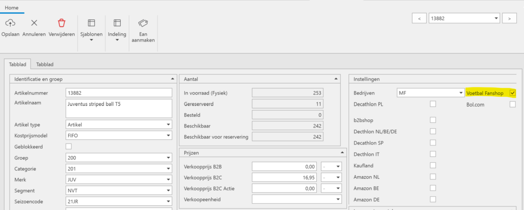 Om artikelen en/of varianten te synchroniseren moet er op het artikel een vinkje worden aangezet om aan te geven dat het artikel of product moet worden gesynchroniseerd naar WooCommerce. Verder is er een veld waarin het id binnen WooCommerce wordt opgeslagen: wcproductid