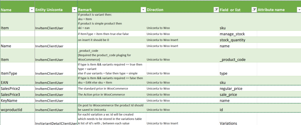 The standaard mapping die wordt gebruikt voor aanmaken Producten in WooCommerce Uniconta: