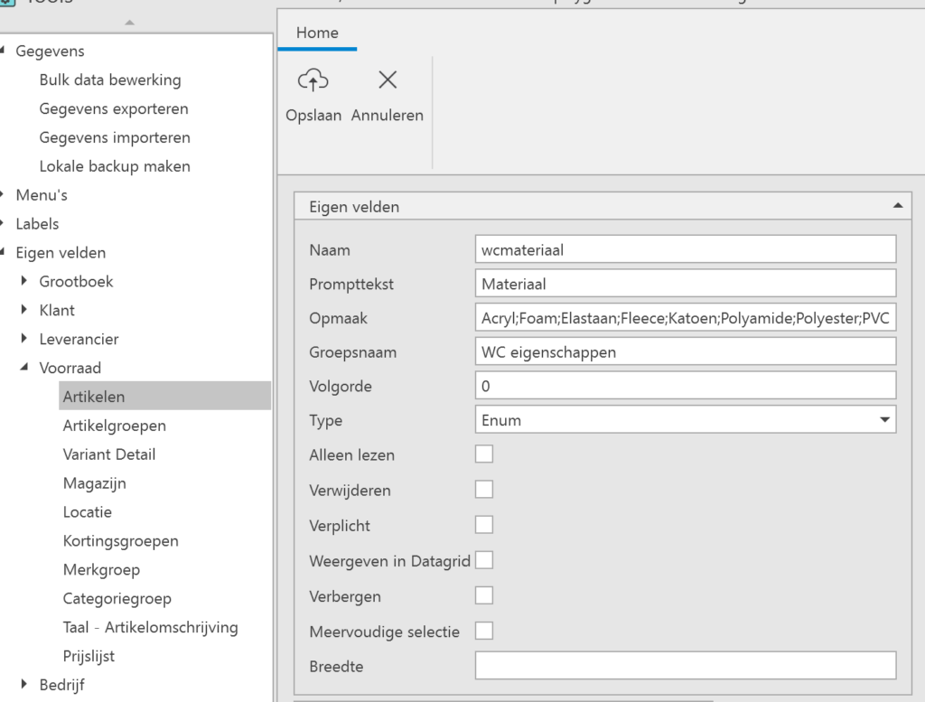 - Eigenschap velden worden als eigen velden worden aangemaakt op het artikel aangemaakt in Uniconta. Het veld van het type Enum en alle mogelijke waarden in opmaak, gescheiden door: “;”